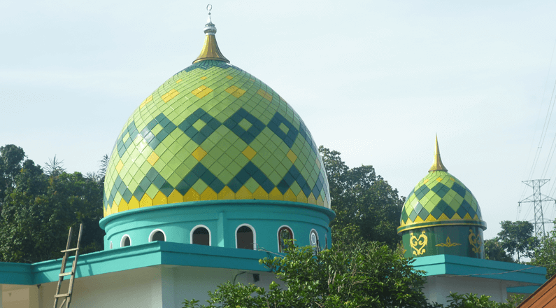KUBAH MASJID GALVALUM – Galvalum atau Zincalum adalah merupakan material baja dengan pelapisan yang mengandung unsur alumunium dan zinc, dengan komposisi aluminium 55 %, unsur seng/zink43,5% dan unsur silikon 1,5%. Aluminium yang tahan karat dikombinasikan dengan zinc yang keras menjadikan kombinasi dari kedua bahan tersebut lebih tahan karat, kuat dan lebih ringan dibandingkan dengan galvanis. Bahkan beberapa referensi menyatakan bahwa material atap baja ringan zincalum atau galvalum lebih tahan karat/korosi mencapai 4 kali lipat dibanding baja berlapis Galvanis.